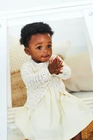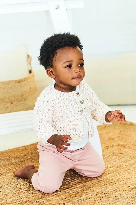 You will need: 4mm (UK 8 - USA G/6) crochet hook, locking stitch markers. Long cardigan: 6 buttons, 1cm, ½in. Short cardigan: 3 buttons, 1cm, ½in.
