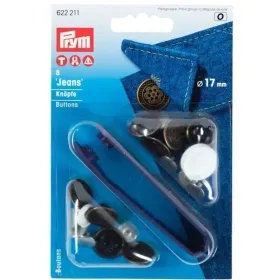 The Prym jeans buttons are designed specifically for use on denim jackets, denim shirts and jeans trousers. The non-sew buttons can be mounted either with the tool and a hammer, the VARIO pliers for non-sew products or the tripod mount. Since the jeans buttons are made of stainless brass, they can of course be washed at 60 degrees and dry cleaned.