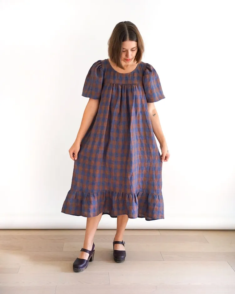 The Champagne Field Dress is a prairie style dress with patch pockets and optional patchwork view with inseam pockets. The front and back bodice include soft gathers that sit above the bust. View A is a mini dress, hitting above the knee and includes a flutter sleeve. View B is a midi dress, hitting mid calf with a high-low hem and gathered puff sleeves finished with a wide elastic cuff. Both views include a large bottom ruffle. View C is a babydoll style top which include soft gathers that sit above the bust and has a flowing bell sleeve. The length is semi cropped that hits right below the natural waist.
