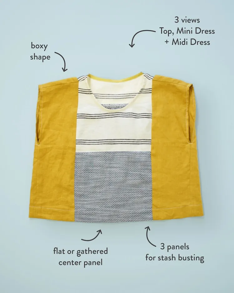 The Skipper Top and Dress has a relaxed, breezy silhouette with a loose and boxy fit, but is not oversized. It features a scoop neck and slight dropped shoulders, giving a mini cap sleeve appearance. The back has a high yoke with a soft, gathered panel. View A is a slightly cropped top designed to hit between the belly button and high hip, View B is a mini dress with patch pockets and View C is a midi dress with inseam pockets and side slits. Both dress views create a flattering, column-like silhouette.