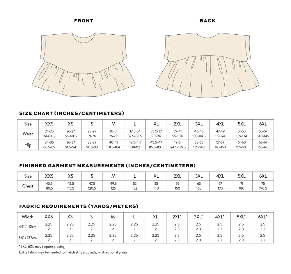 Pattern includes sizes XXS - 6XL (Bust 31” - 64” / 79cm - 162cm)