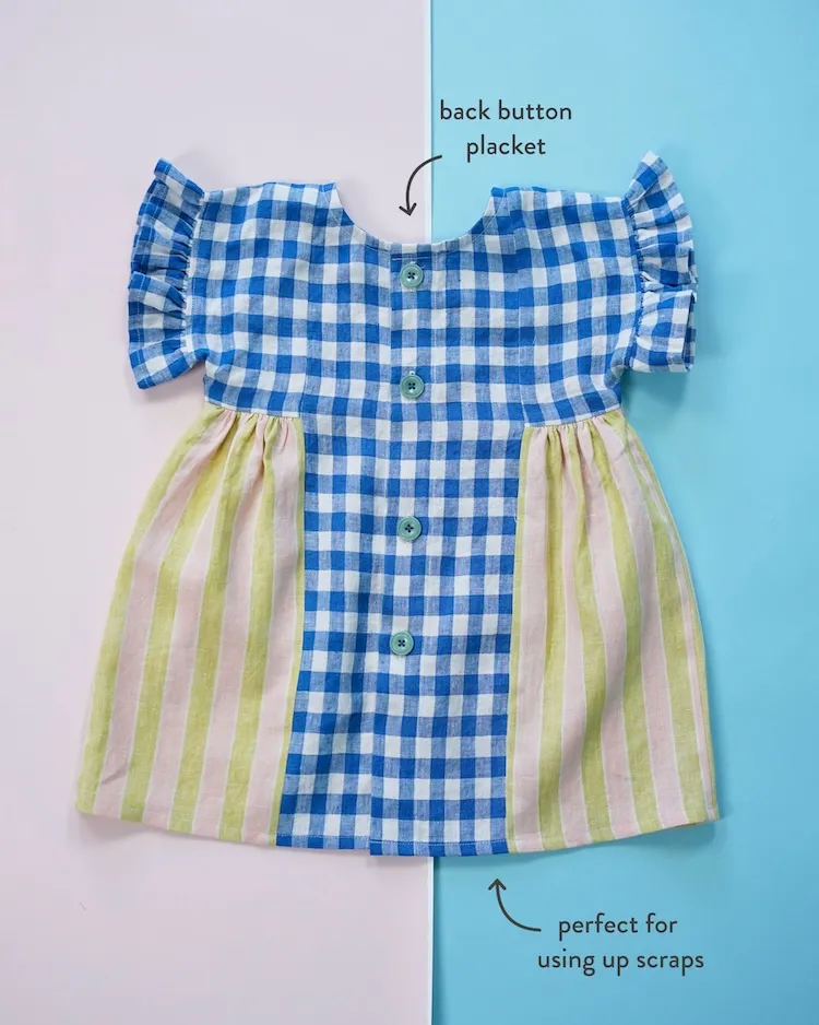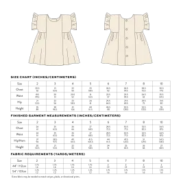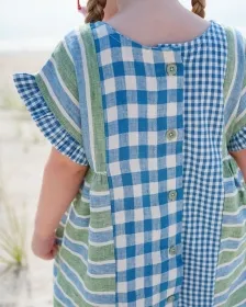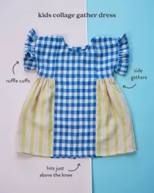 The Kids Collage Gather Dress is a playful spin on our best-selling Collage Gather Top and Dress—designed to match, but with a few sweet twists just for little ones. It features the same relaxed and easy going silhouette with the cute side gathers you love, now with a touch of whimsy thanks to frilly ruffle cuffs and an easy-to-sew back button placket. Whether stitched up in a single fabric or pieced together with beloved scraps, it’s a fun and satisfying project for sewists of all levels. This pattern is all about creativity, comfort, and joyful sewing. Designed to sit just above the knee with a loose and relaxed fit, it’s perfect for twirling, running, and all the joy-filled moments of play.