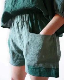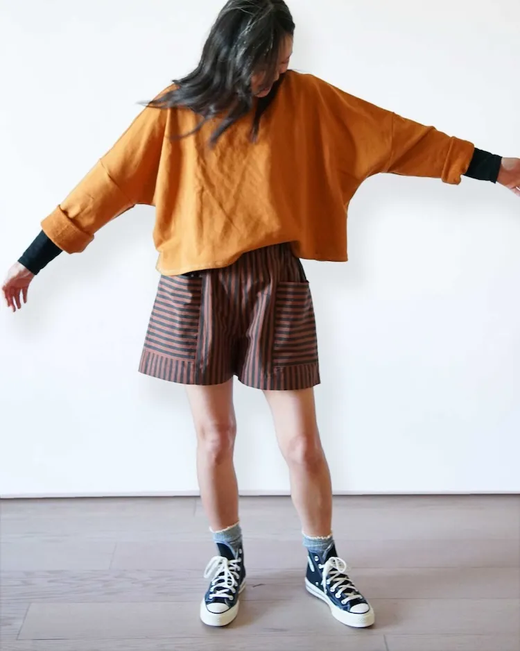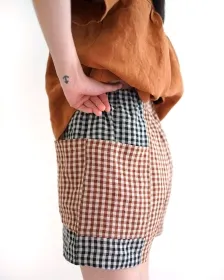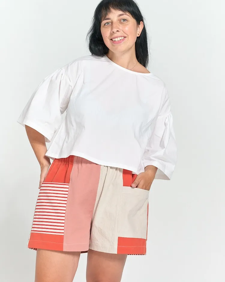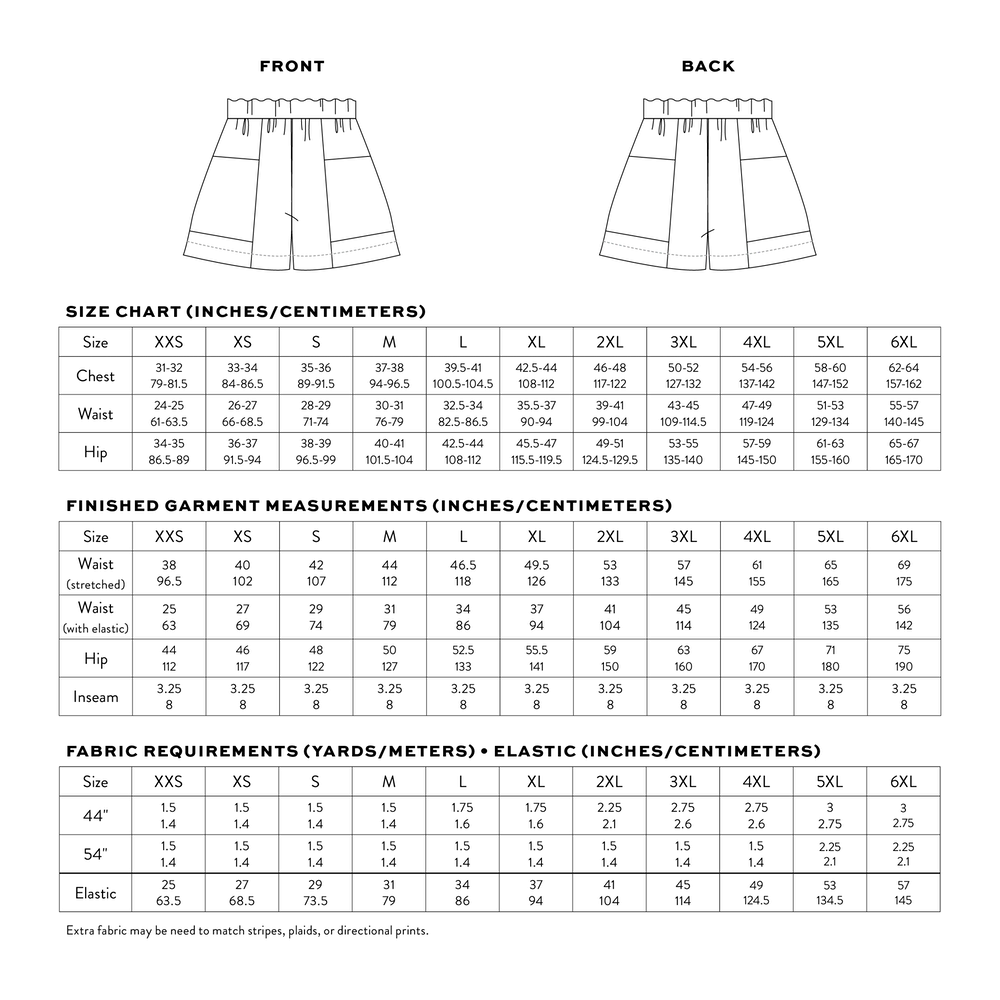 The Weekend Chore shorts are a loose fitting, stylized utility short with fun pocket details. They feature a high rise gathered elastic waist, a 3 1/4" inseam and roomy apron style front and back pockets that match at the side seams, big enough to comfortably contain all your everyday items and more. Designed to look great in a single fabric or patchwork style.