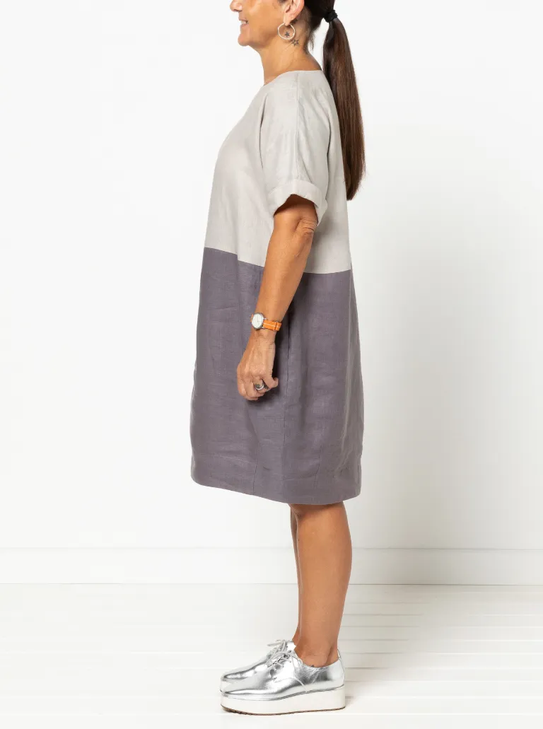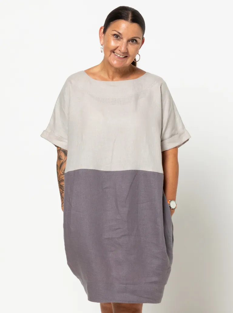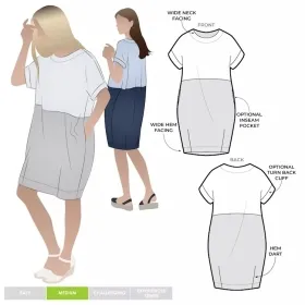 This sewing pattern creates a knee-length pull-on dress with a cocoon shape and generous fit. Features include extended shoulder breadth, hem darts and options for turn-back sleeve cuffs and inseam pockets.