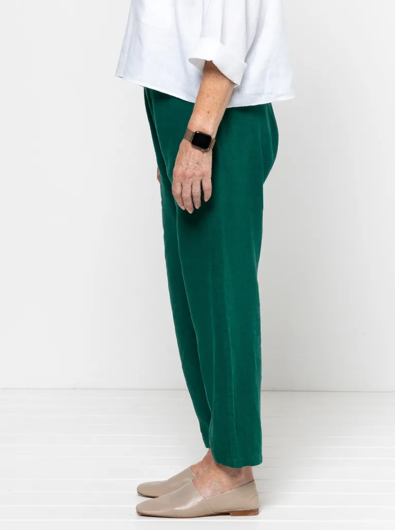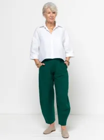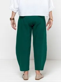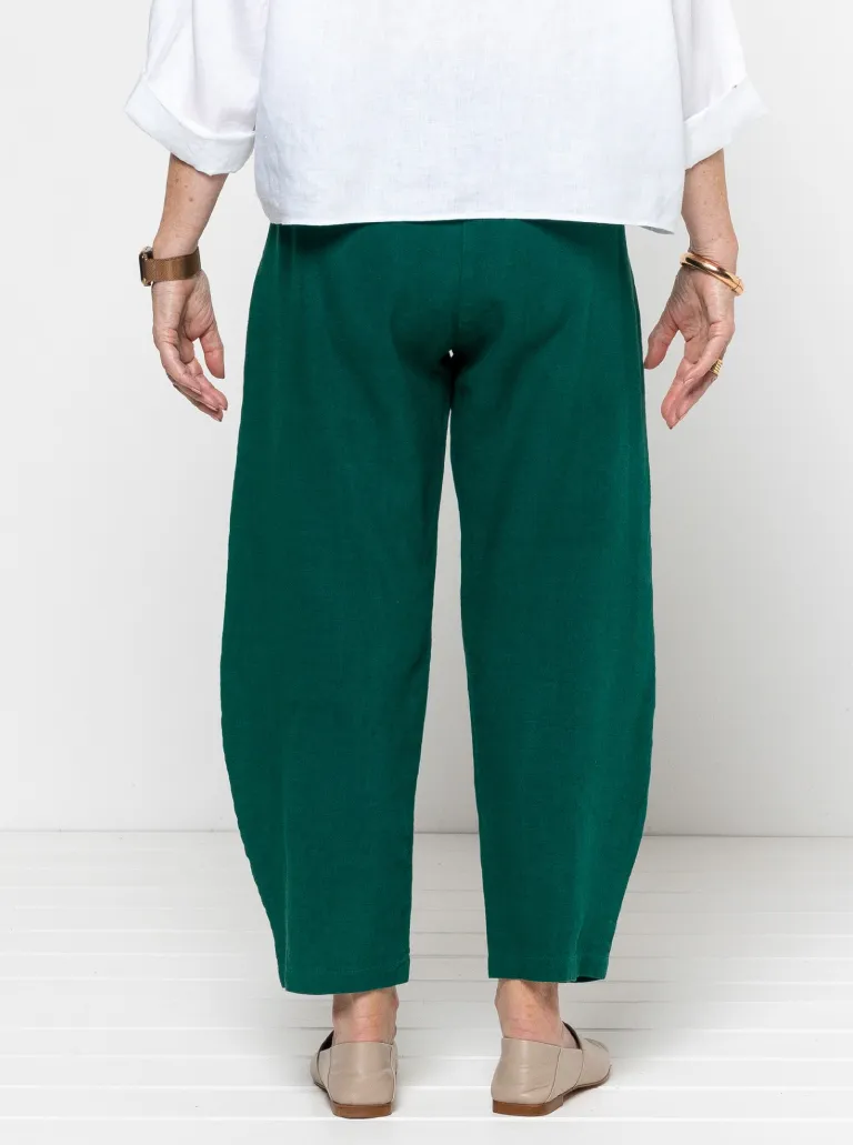 The Barry Woven Pant is an elastic waisted pant with a slight balloon-shaped darted leg. It has angled pockets, faux fly and a ruffled edge on waistband. It sits on natural waist.