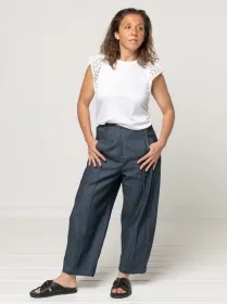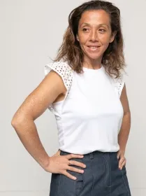 The Petal Knit top sewing pattern creates a stylish fitted round neck tee with a high hip length. For a feminine touch, you can add optional woven frill sleeves.