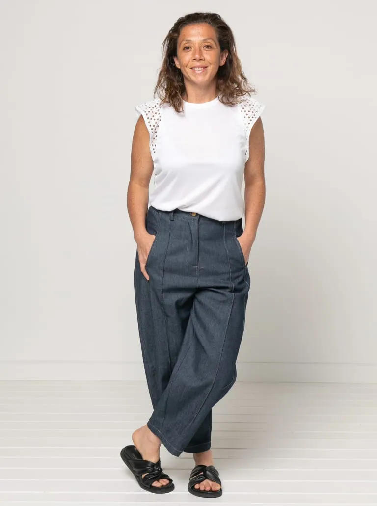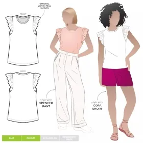 The Petal Knit top sewing pattern creates a stylish fitted round neck tee with a high hip length. For a feminine touch, you can add optional woven frill sleeves.