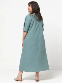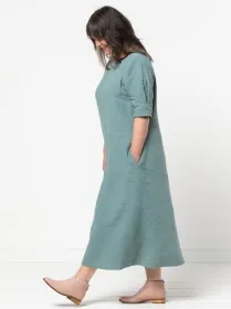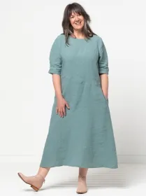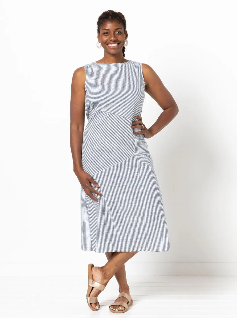 The Yvette Woven Dress sewing pattern creates a regular-fit, calf-length A-line dress with asymmetrical design lines, a boat neck, sleeveless or elbow-length cuffed sleeves, a loop and button back neck closure, and optional inseam pockets.