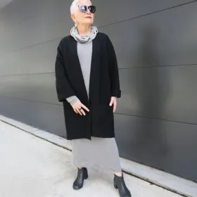 The Berlin Jacket is a collarless, longline jacket featuring patch pockets, extended dropped shoulders and full-length sleeves with a turned back cuff. The back neck is slightly raised. Effortlessly stylish, the jacket is the ideal winter wardrobe staple and perfect for layering over dresses or any casual outfit.