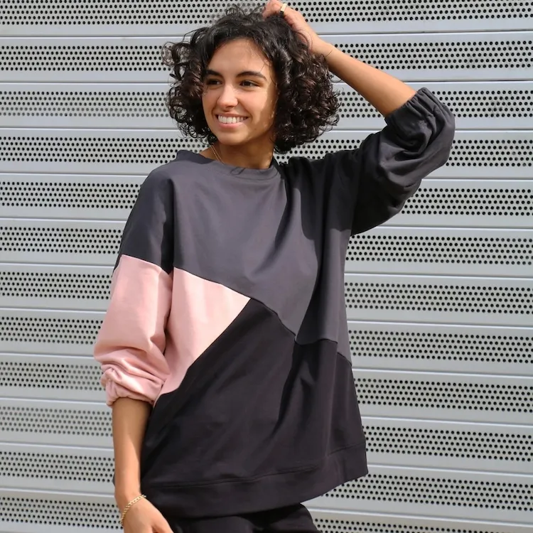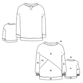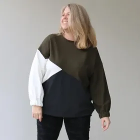 The Lennox Sweatshirt is a loose, boxy style feauring drop shoulders and self-fabric neck and hem bands with twin needle detail stitching. View A has a traditional V-detail at the neckline and View B has striking asymmetric colour-blocking. Sleeves can be either tapered with a sleeve band or straight and gathered into wide elasticized cuffs.