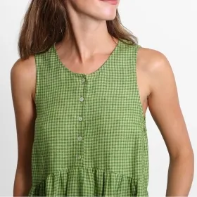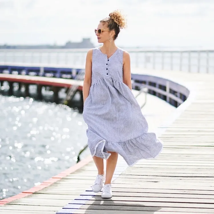 The Lisa Dress is a loose and comfortable summer style that features a sleeveless bodice with button/buttonhole opening, bust darts, contoured high waistline and a gathered skirt with side pockets. It can be worn on its own or over a t-shirt or tank top.