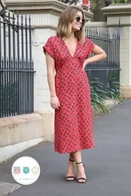 Vintage inspired, the Lois Dress features a v-neck bodice and a floaty, A-line skirt that falls to a flattering midi length. Finishing features include cuffed arm bands, a top-stitch detail around the neckline and waist, and an invisible side zipper.