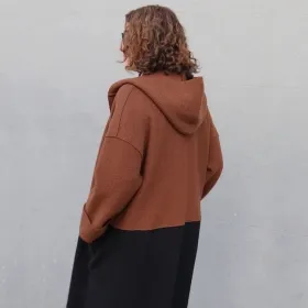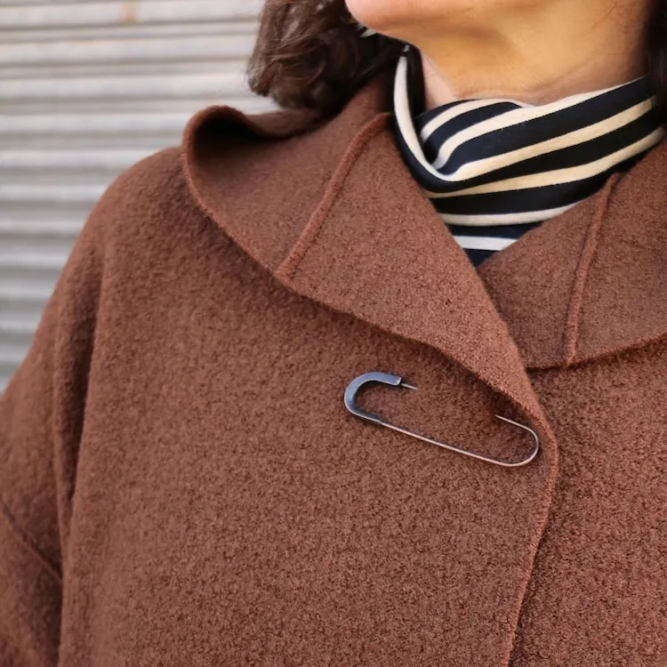 The London Coat is oversized and unlined. The coat front has a 4" overlap which can be left open or secured with a feature pin, making it the perfect layer for a relaxed autumn/winter style. It features a hood, dropped shoulders and full-length sleeves with turned back cuffs. The horizontal hip seam, with inseam pockets, provides the opportunity for colour blocking. As seams are overlapped and edges and hems left raw, this coat is best made up in boiled wools, felted wools that do not fray when cut.