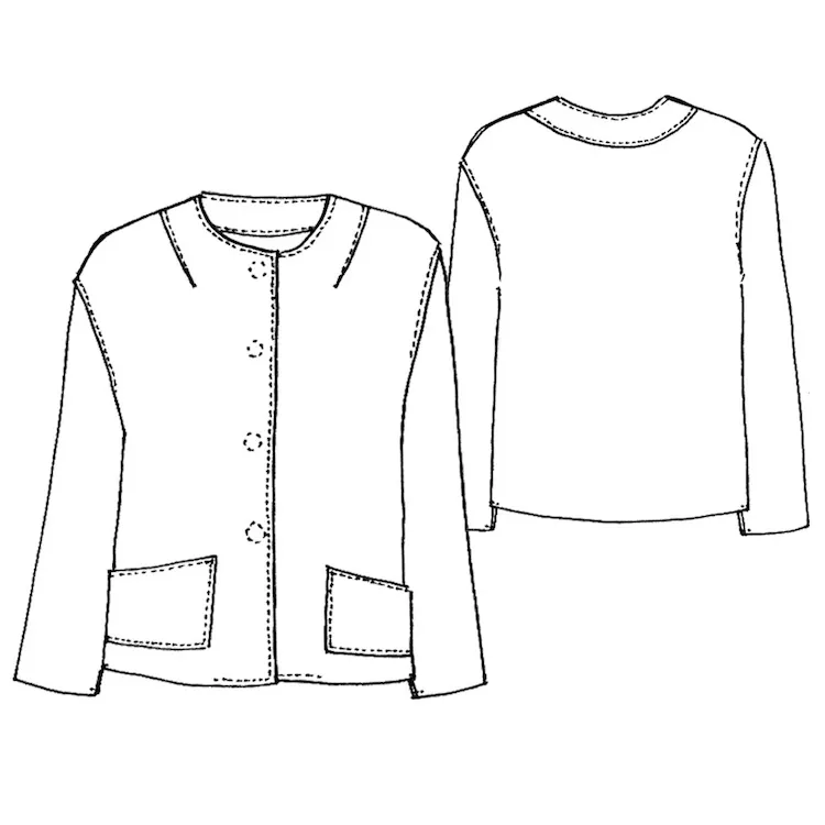 The Lyon Jacket is a semi-fitted collarless, hip length jacket and features front shoulder darts, back neck band, drop shoulders, bracelet length sleeves and patch pockets.This quick and easy sew is finished with four sew-on press studs and can be worn closed or open as the perfect layering piece for cooler months.As most seams are overlapped and hems are left raw, it is best made up in boiled/felted wools that do not fray when cut.