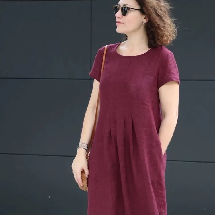 The Milenda Dress is a simple and timeless pull-on dress featuring short sleeves and all-important side pockets. Stitched-down pleats on both front and back release into the skirt to create extra shaping.