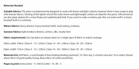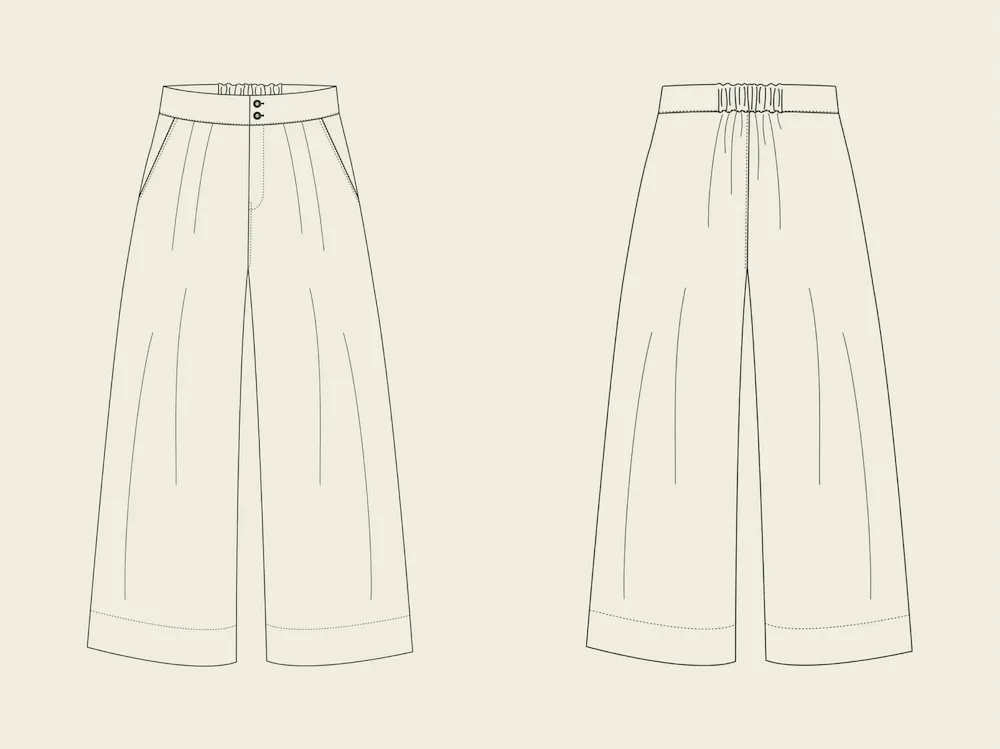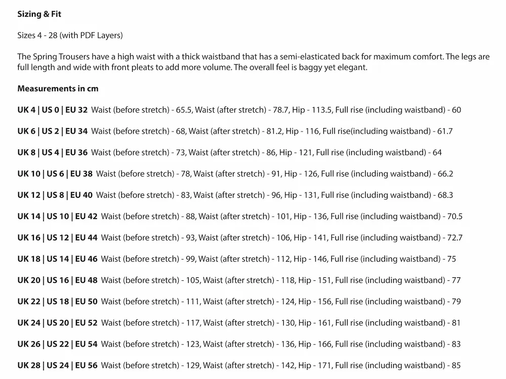 The Spring Trousers are designed to feel breezy and elegant with plenty of space to move. They work amazingly well in a huge range of fabrics, from silks to denims, linens and heavy corduroys. Your fabric choice will determine the character of your garment; you could make a cosy corduroy trouser for winter or a floaty silk piece for a wedding. Both work equally well which is unusually versatile for a pattern.