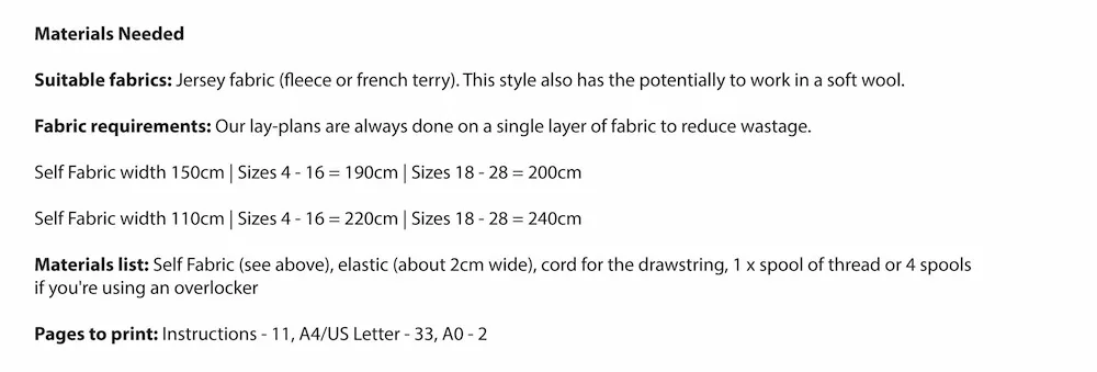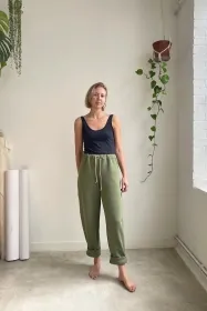 The Sunday Trackies were designed for days where you want that extra level of comfort. This design is unfussy, roomy in fit and intended to feel like a second skin on a sleepy Sunday. It is a simple piece to make which means it’s a great project for beginners.