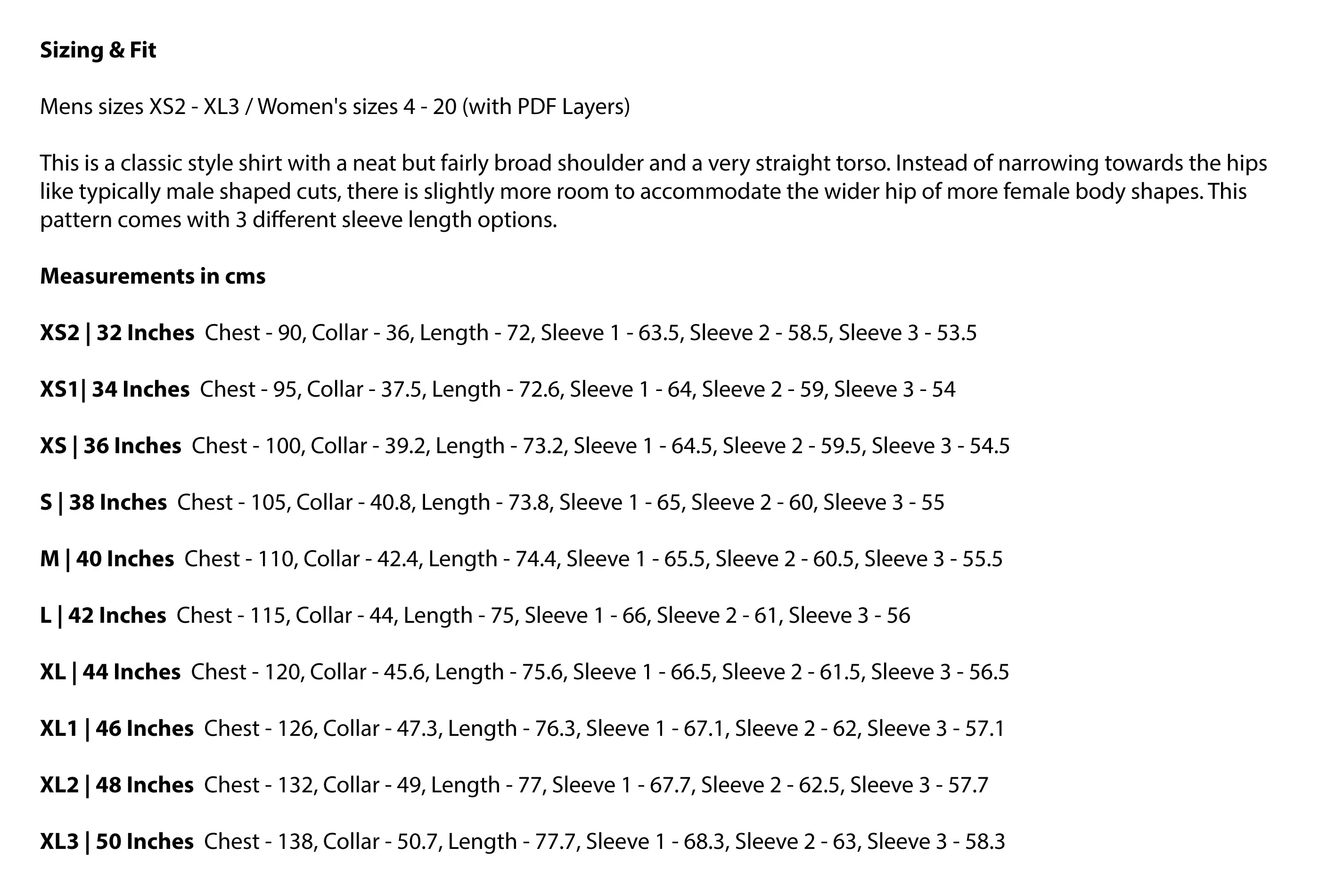 Mens sizes XS2 - XL3 / Women's sizes 4 - 20 (with PDF Layers)