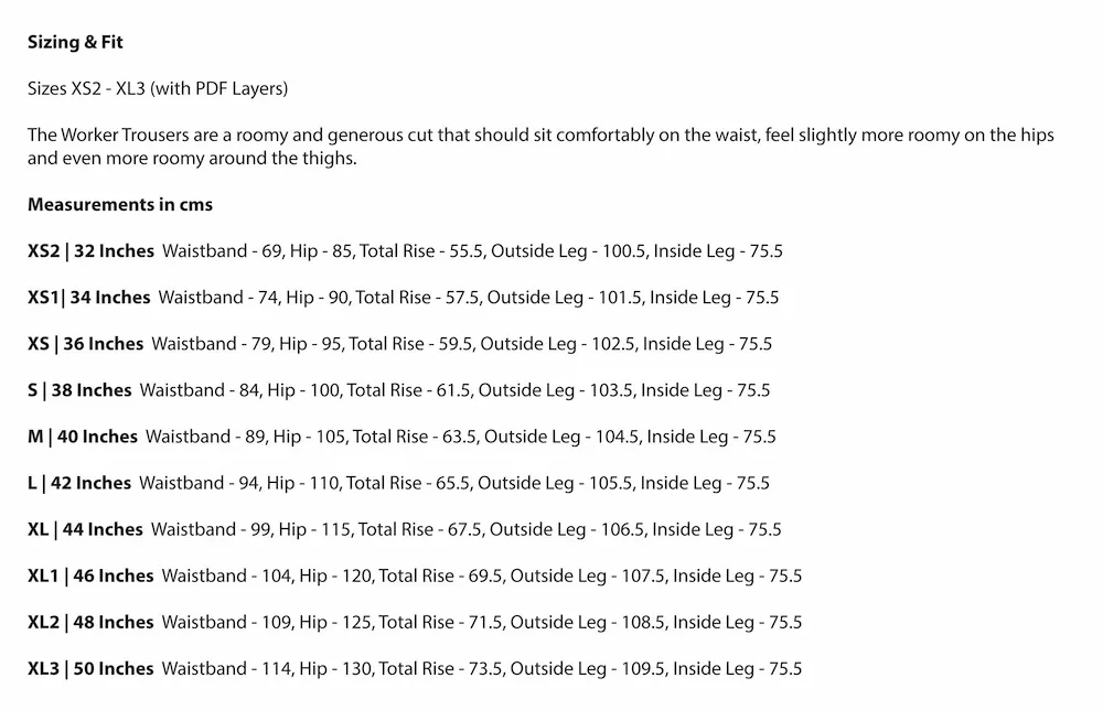 Construction techniques: Concealed button fly or zip fly with binding detailing, side pockets, patch pockets, flat felled seam, waistband & belt loops.