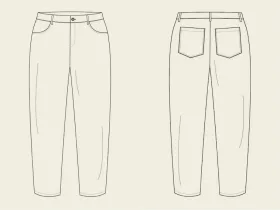 Construction techniques: Concealed button fly or zip fly with binding detailing, side pockets, patch pockets, flat felled seam, waistband & belt loops.