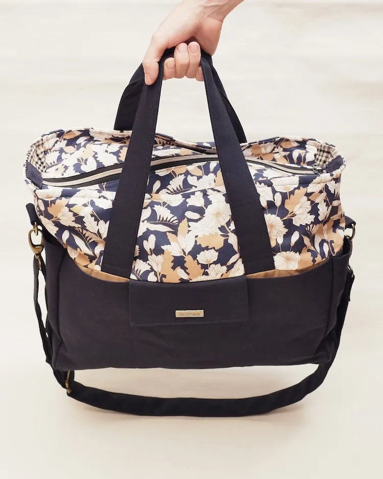 Some of the useful components include two large side pockets for waterbottles, a zippered front pocket, three back pockets (one featuring a flap to secure your phone where it can be easily accessed), a recessed top zipper closure, a detatchable cross-body strap, shoulder straps, a full lining, and an inner zippered pocket. Depending on the details selected, this bag can be a very quick or a very involved project.