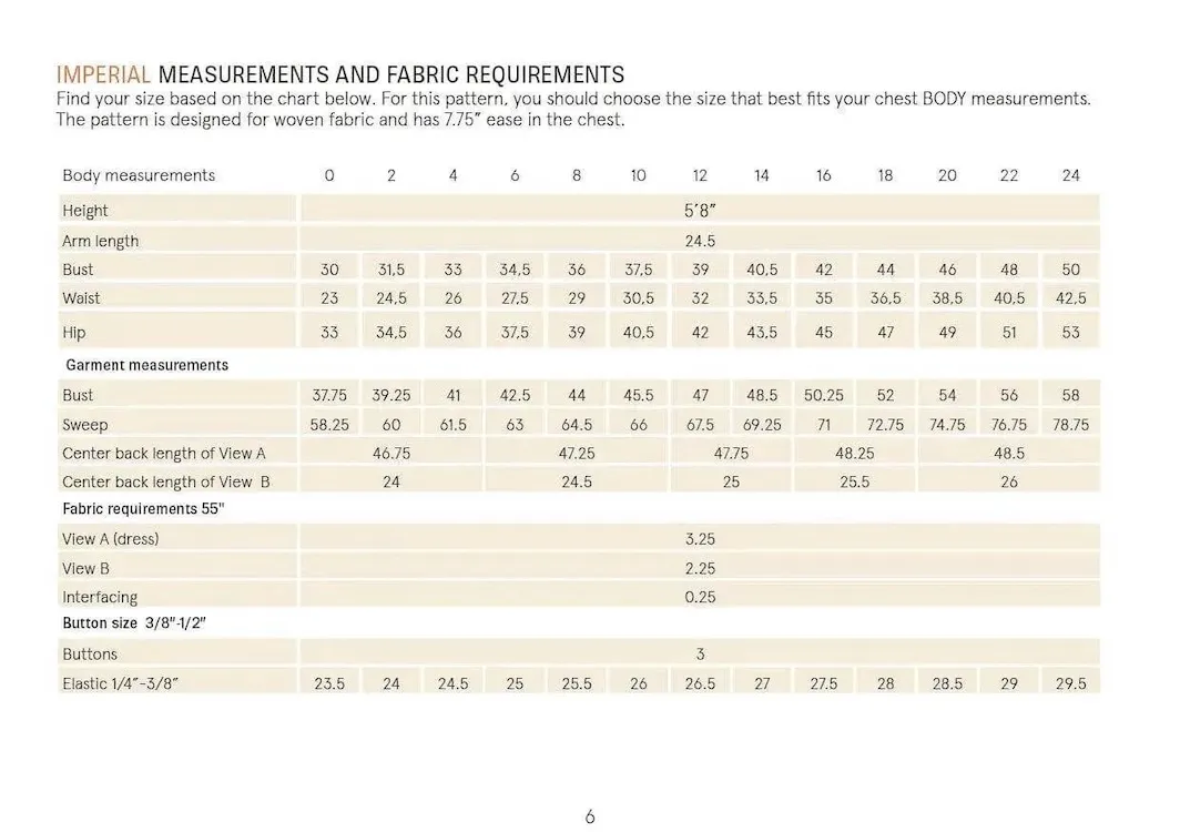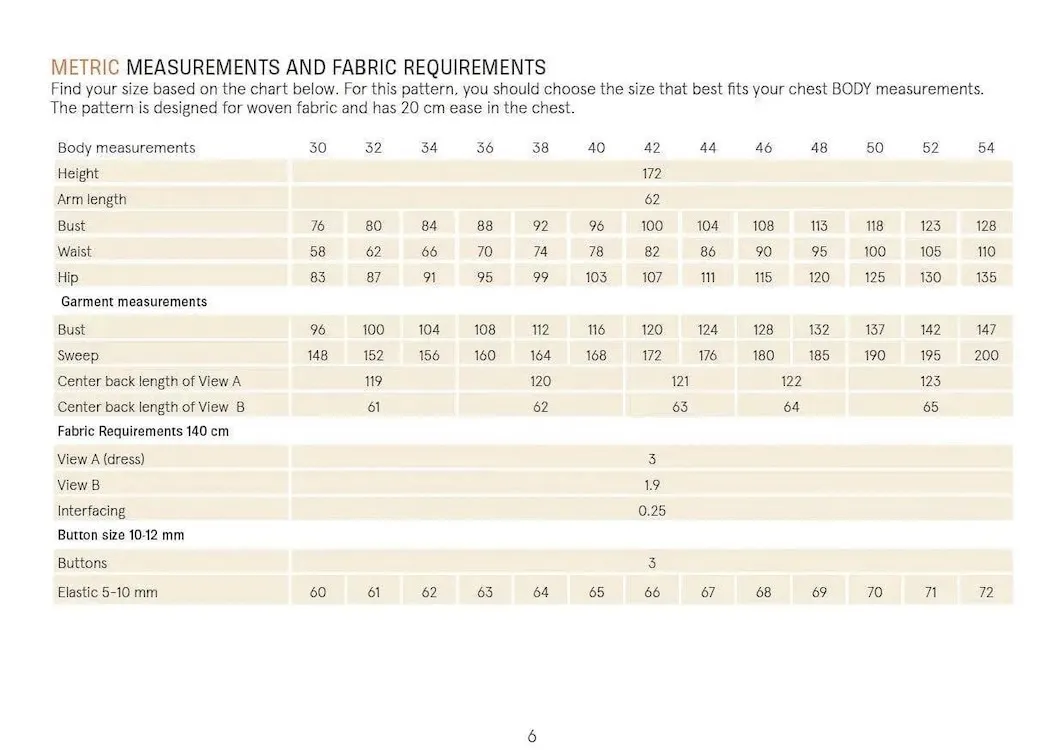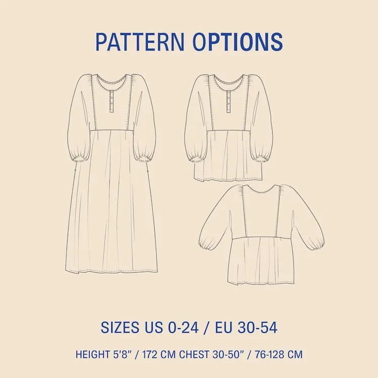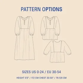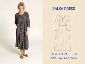 The Balka dress sewing pattern is for woven fabric and includes the following sizes: 0-24 / 30-54.