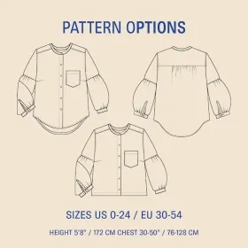 The Puff Shirt sewing pattern is a charming and versatile blouse featuring elegant gathering details on the sleeves and back yoke. Its contoured collar sits flat and high against the neckline. The set-in sleeves include an upper arm seam, where the lower sleeve gathers to create a beautiful, voluminous silhouette.